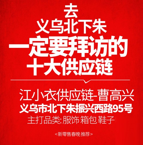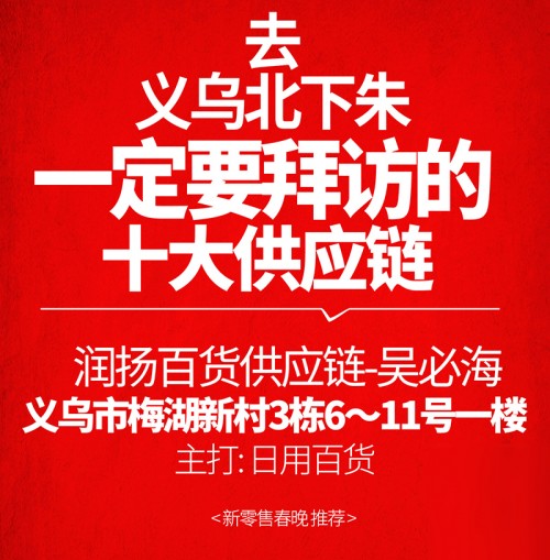 为更好推进社群团购与网红直播带货供应链,由沸点天下发起的新零售春晚将于12月20日在杭州G20峰会场举办,活动将推选一些优质的供应链,为社群团购平台和网红直播服务,提供优质货源,首批义乌北下朱社群团购供应链名单公布。