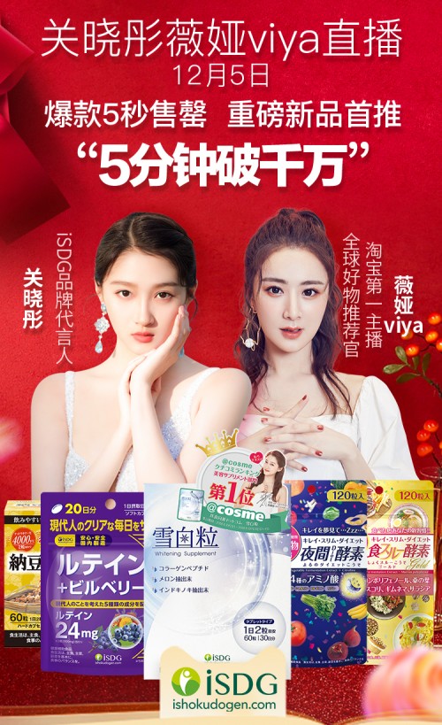 日本知名营养品牌iSDG继双十一之后,销售额再创新高!12月5日,iSDG品牌代言人关晓彤做客薇娅viya直播间,一起畅聊自然美丽小心机,和iSDG产品带来的美好改变。直播5分钟销售额破千万,其中,新品雪白粒、叶黄素、纳豆生活5分钟售罄!